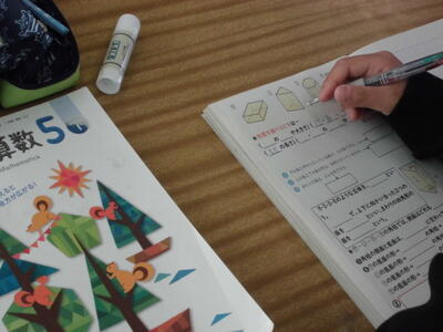 ↓ 本日の学校の様子、5年生の算数の授業です。立体の面や辺や頂点の数を数えたり問題に取り組んだりしています。
