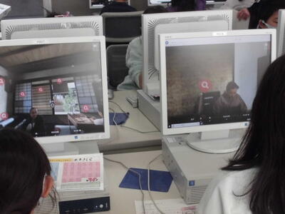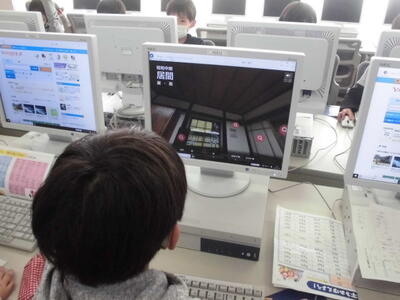 ↓ 3年生がパソコン室で、社会科の「昔のくらし」の学習をしています。パソコンでバーチャル(仮想)の空間で昭和時代の家の中や建物や路地の様子を学んでいます。