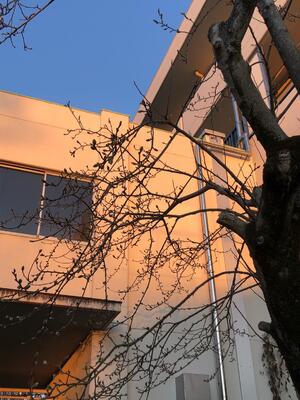 ↓ ある日の、朝の様子です。校舎が朝焼けに染まっています。校庭の木々も芽吹いて、春も目の前です。
