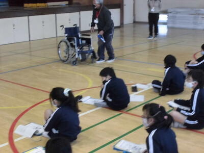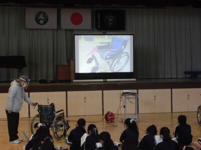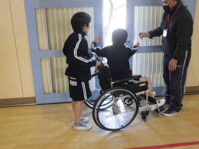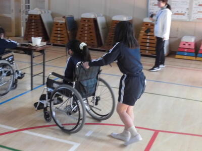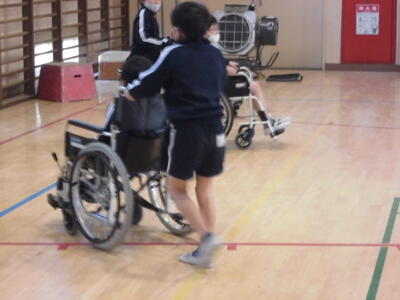 講師の方に車イスの使い方を教えていただいた後、自分たちで車イスに乗って押したもらったり、車イスを後ろから押したりしてみました。どういう気持ちで人に接することが大切かを学んでいます。