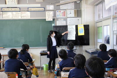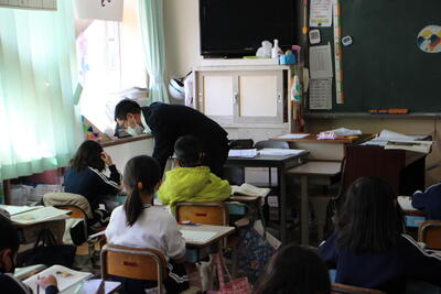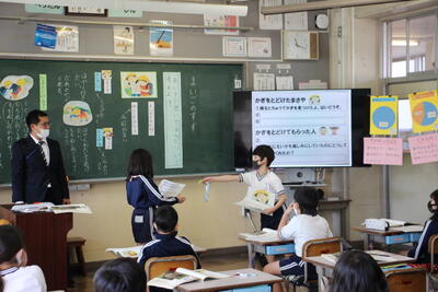 ( ↓ 本校の教育に協力いただいている学生ボランティアさんが、2年生の子供たちにダンスの振り付けを教えてくれています。)