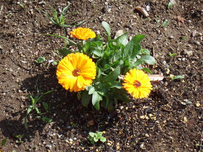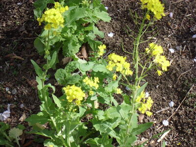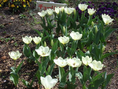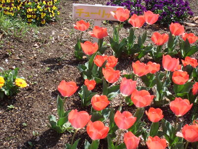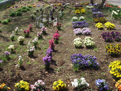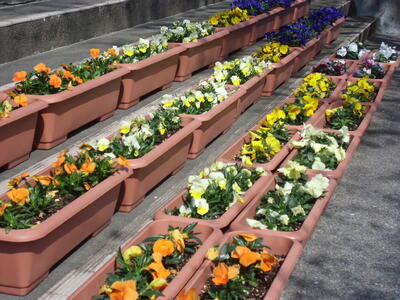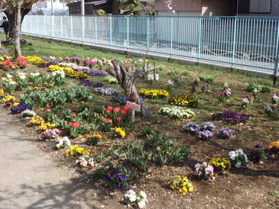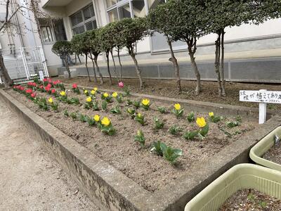 春を迎えた学校の敷地では、色とりどりの花が咲いています。