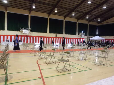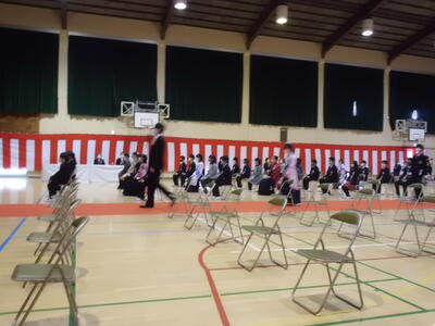 ( ↓ 卒業生の「別れの言葉」です。保護者席の方を向いて、一人一人が堂々と言葉を述べました。そして合唱も、マスクをつけながらでしたが、大きな声のすばらしい音が体育館に響きました。)
