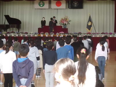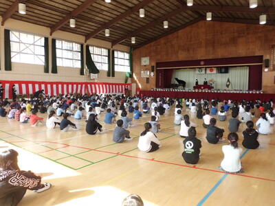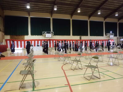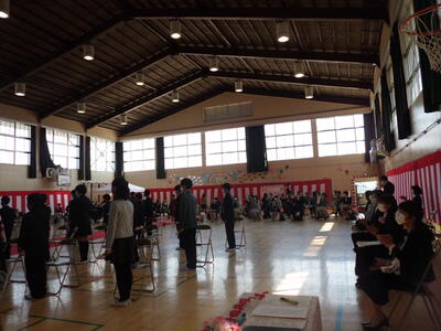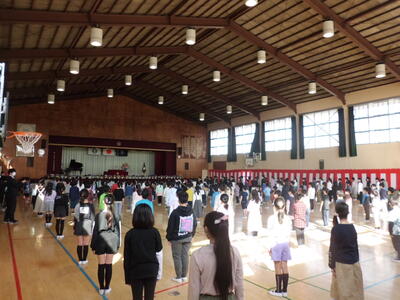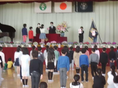 ↓ 修了式の様子です。6年生が卒業して、1~5年生だけでの修了式ですが、密を避けて間隔をあけて並んでいます。
