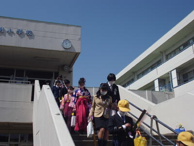( ↓ 卒業生が、教室で最後の学級活動を終えて、先生たちと保護者の方がつくる花道の間を退場します。いよいよ卒業、旅立ちの時です。)