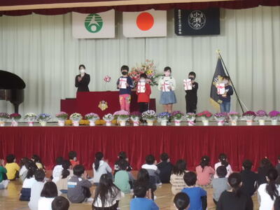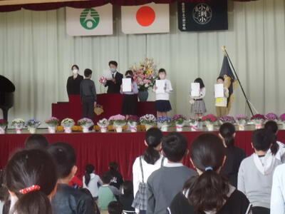 ↓ 式の後、後期の代表委員に、校長先生から「ひまわり賞」が渡されました。