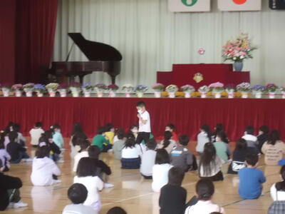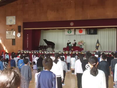 ↓ 校長先生のお話、全校児童を代表して一年生児童が、今年度のまとめの感想を発表しました。