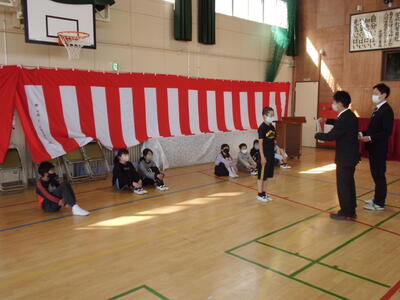↓ 各学年の代表児童に、校長先生から終了証が授与されます。