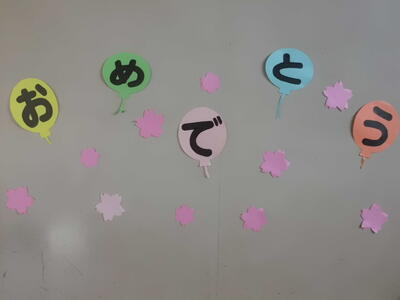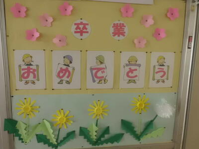 春休み2日目です。学校内の掲示物を紹介します。卒業シーズンや春をイメージした掲示物が、各学年の廊下に貼られています。