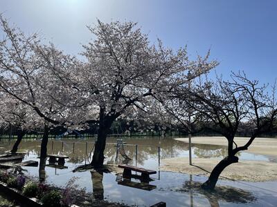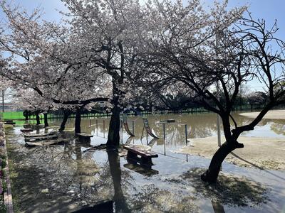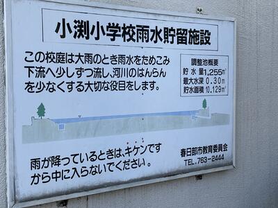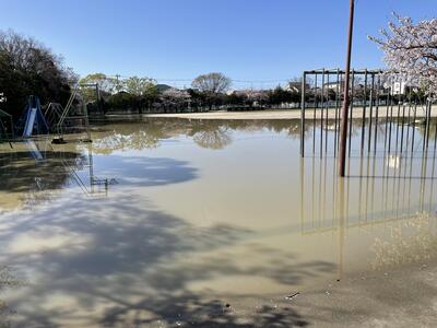 ( 小渕小の校庭は、川のはんらんをおさえるため、大雨の時には校庭に水がたまるようになっています。)
