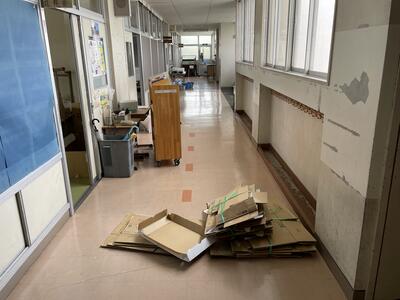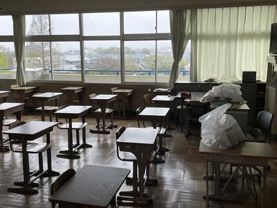 ( ↓ 学校の中では、教室の整備が進んでいます。新年度の子供たちを迎える準備です。)