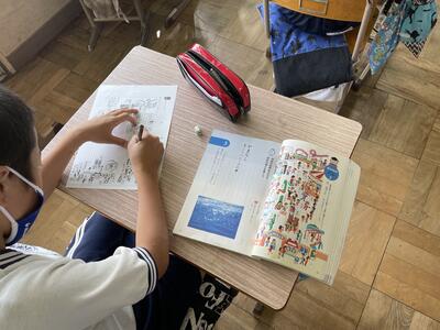 ( ↓ 自習に取り組んでいます。漢字のプリントに集中して向かっています。)