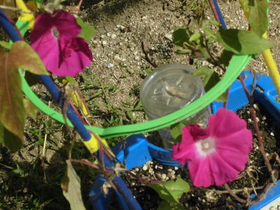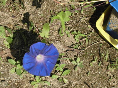 ( ↓ 2年生の育てた、植木鉢のアサガオもまだたくさん咲いています。)