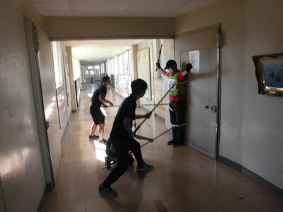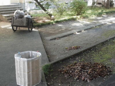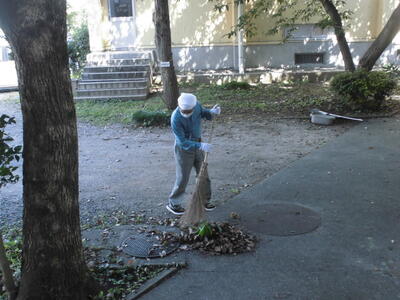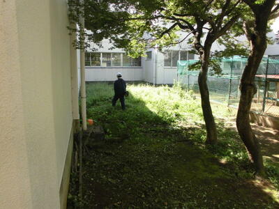 学校はたくさんの草木があります。日ごろから、学校の職員や子供たち、で草刈りや落葉掃きを行っています。