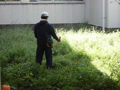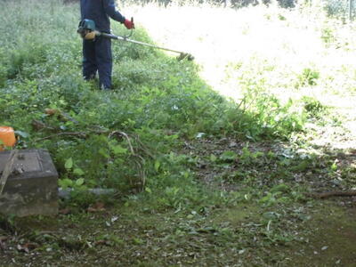 ( ↓ 校長先生が草刈り機で除草をおこなっています。)