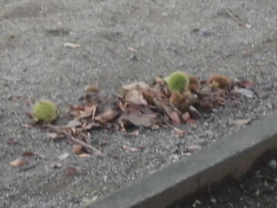 ( ↓ 校務員さんが、クリのイガや落ち葉を掃き集めています。)