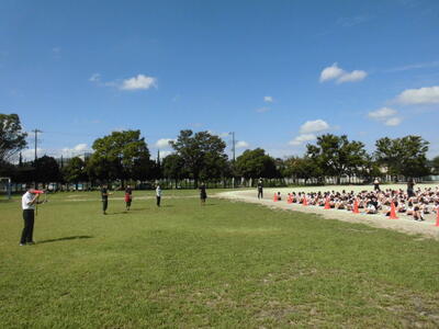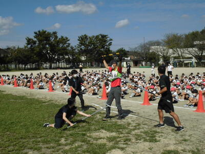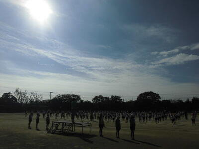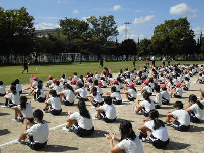 朝は校庭での「さわやかタイム」、全校の運動の時間。感染症対策に気をつけて、マスクを着用しながら無理のないよう体を動かしました。