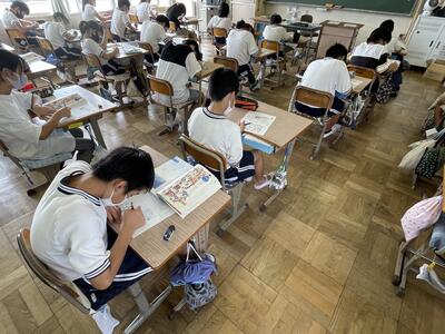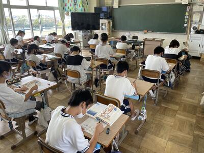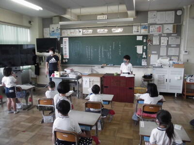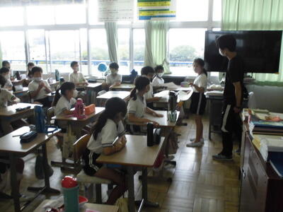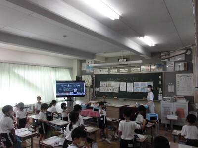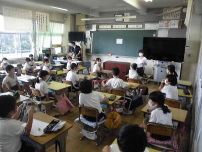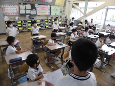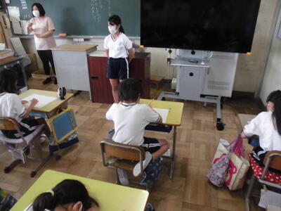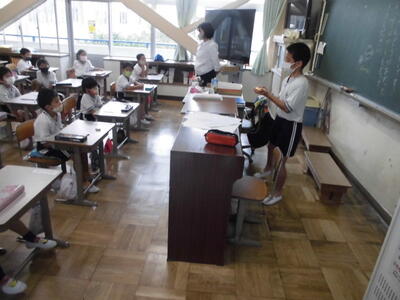 本日の朝は、児童集会です。本来は体育館に集まって、全校児童で一斉に行うところですが、現在は感染症対策のため各教室で行いました。上級生の委員が、各教室に出向いて活動を進行しました。