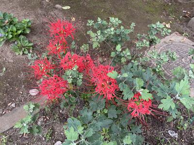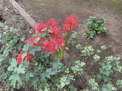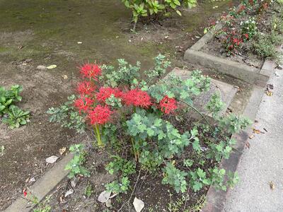 最近、あちらこちらで、紅いヒガンバナ(マンジュシャゲ)が咲いています。学校でも、花壇に少しだけヒガンバナが咲きました。