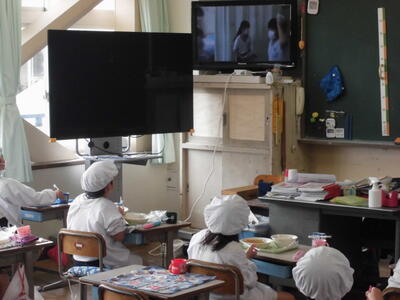 今日の給食の時間は、保健委員によるVTRがテレビ放送で流され、各教室で視聴しました。これも、本来は体育館で集会を行って、保健委員が全校児童に伝える内容ですが、感染症対策のため、今回はテレビ放送で行いました。