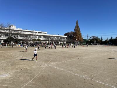 8:00 子供たちが外に出て、元気に校庭を走っています。