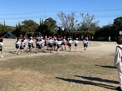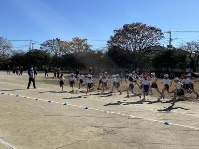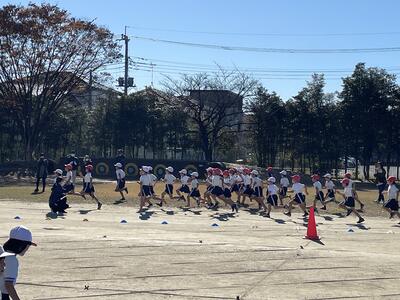 11:40 5、6年生が校庭に集合しました。高学年の部が始まります。5年生、6年生ともに1300メートルを走ってます。