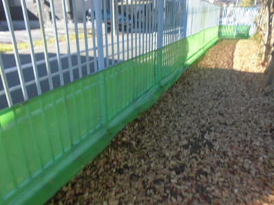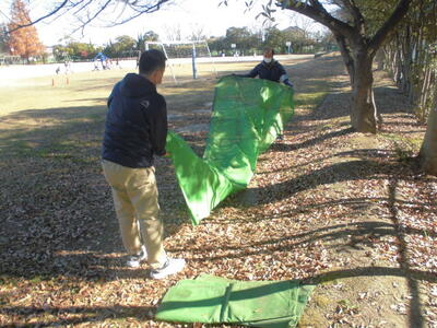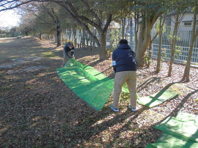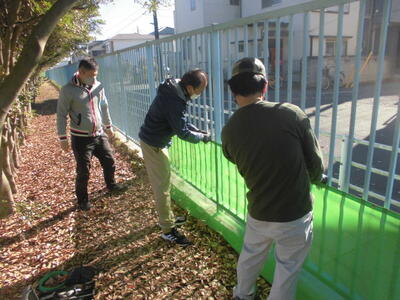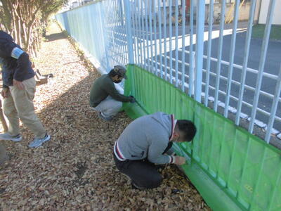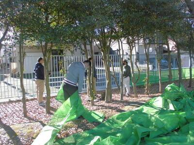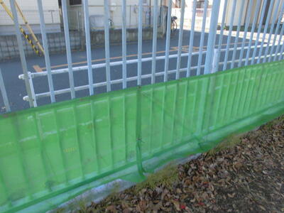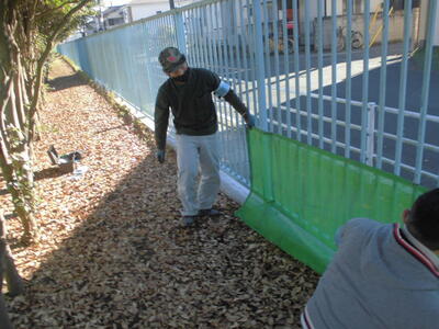 本日は、おやじの会の方が活動をしてくれました。学校の敷地内の樹木から落ち葉が、学校外の道路に散らばってしまうので、フェンス沿いにネットを張っていただきました。