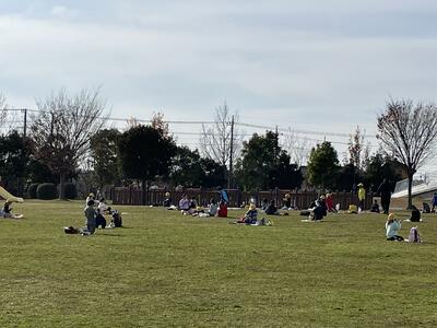 12:40 まつぶし緑の丘公園に到着して、2クラスが合流しました。ここで昼食(お弁当)になります。
