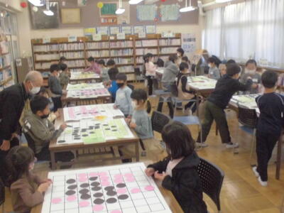 ( ↓ 図書室では、1・4年生がオセロ遊びをおこないました。大きめのオセロをつかって、友達と対戦を重ねました。)