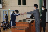 初めに持久走大会に向けて全校手取り組む「Run×3(ランランラン)」の表彰がありました。合計でたくさん走ったクラスが表彰され、代表児童がクラスの賞状を受け取りました。