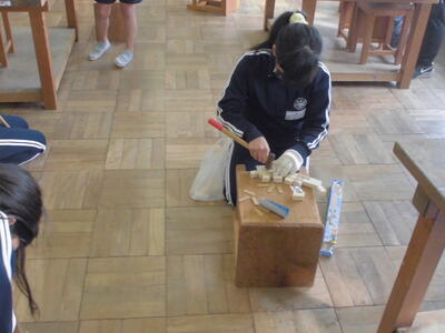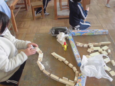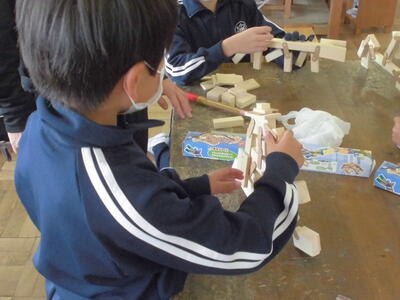 ↓ 四年生の図工の時間で、木工に取り組んでいます。木材を思い思いに切ったり、つなげたりしながら、それぞれが発想豊かに作品を作り上げています。