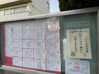 ( 学校の正門の掲示板には、2年生の今年の決意が掲げられています。)