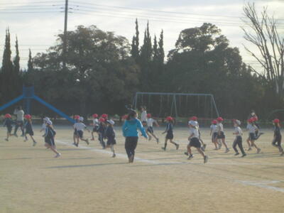 朝のさわやかタイム、全校で運動する時間です。冷たい空気の中でも子供たちの元気な姿が見られます。