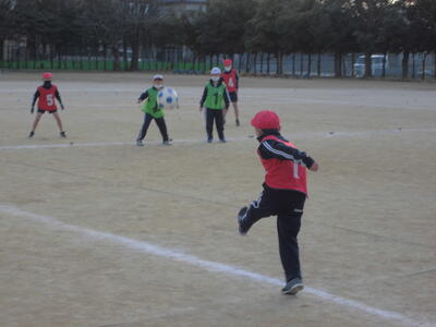 ( ↓ 6年生、体育のサッカー。風にも負けずにボールを蹴りに行きます。)
