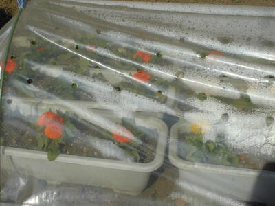 ( ↓ 先日、花壇ボランティアの方に植えていただいたパンジー。防寒トンネルの中で、春を待っています。)