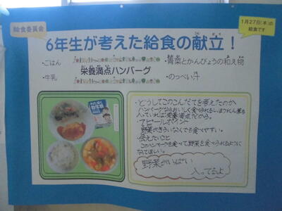 ( ↓ 6年生が考えた「栄養満点ハンバーグ」。1月27日の給食で出されました。)