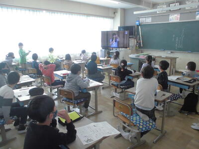 ( ↓ 大型モニターなどを活用して、児童同士が近づかなくてもいいようにしています。)