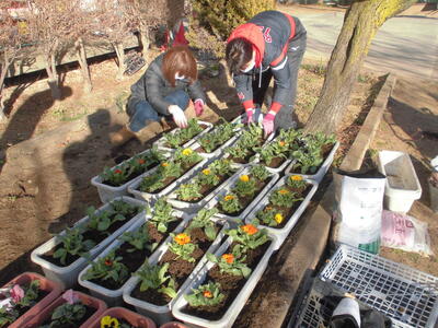 本日は、花壇ボランティアが活動してくれました。校長先生といっしょに、春の花をプランターに植えていただきました。風も強く、寒い中での活動となりましたが、たくさんの花が植えられました。ありがとうございました。