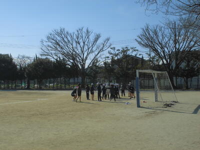 ( ↓ 6年生、体育のサッカー。風にも負けずにボールを蹴りに行きます。)
