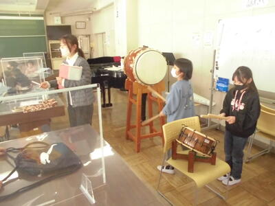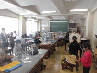 ( ↓ 音楽室の授業。子供たちの間にはパーテーションを設置して、今の時期は打楽器をおこなっています。)