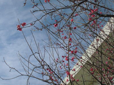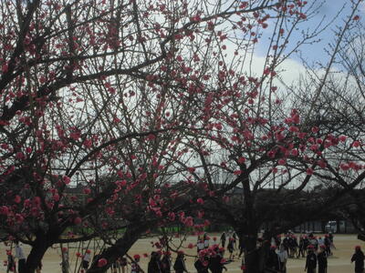 校庭の梅の木に赤い花がたくさん咲いています。