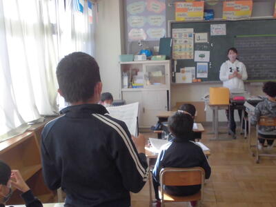 ( ↓ 保健の先生の保健指導。映像や模型を利用しています。)