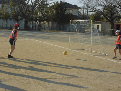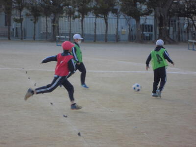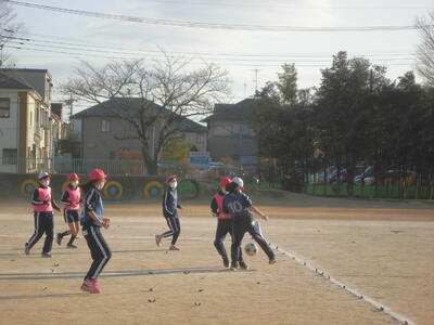 ( ↓ 6年生、体育のサッカー。風にも負けずにボールを蹴りに行きます。)