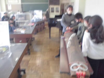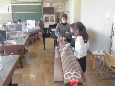 ( 5年生の音楽の授業。琴の音を聞いたり、体験したりしています。)