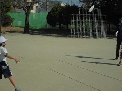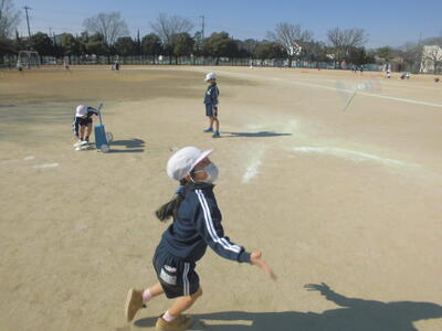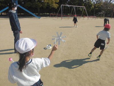 1年生の生活科の時間「つくったおもちゃであそうぼう」。それぞれが手作りした、風をとらえるおもちゃで校庭で遊んでいます。フリスビー、風車、飛行機、風輪、竹とんぼ、などです。