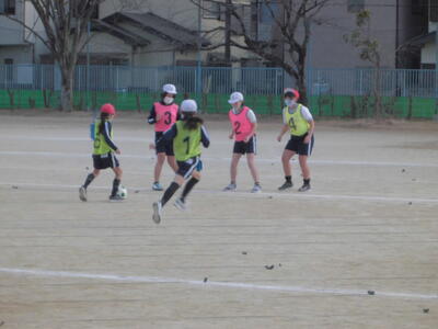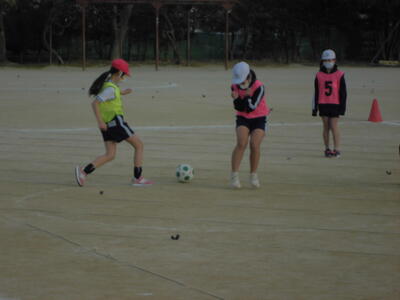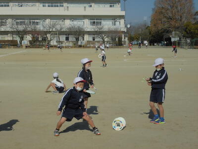 4年生の体育「サッカー」。ボールを追って校庭を駆けています。