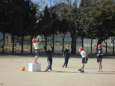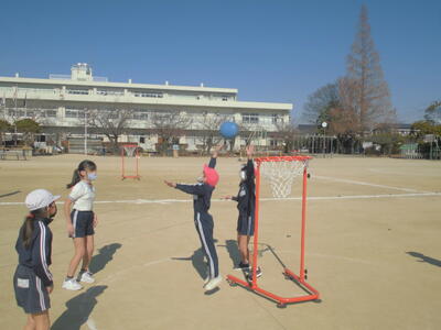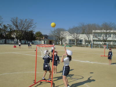 3年生の体育「セストボール」。パスで津内がボールをゴールめざしてシュートします。