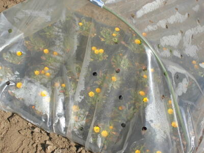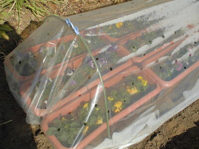( ↓ 先日、花壇ボランティアの方に植えていただいたパンジー。防寒トンネルの中で、春を待っています。)