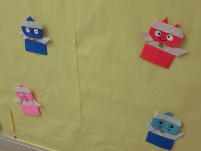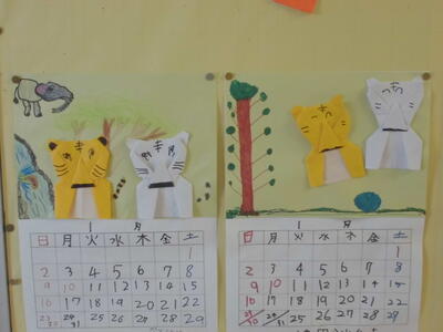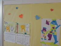 ↓ たんぽぽ・ひまわり学級の廊下の掲示。トラの手作りカレンダーなどが貼られています。