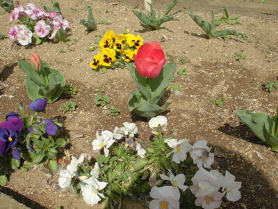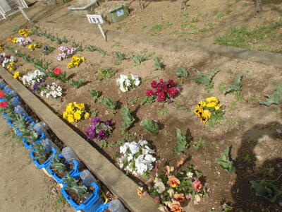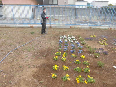 今日は、花壇ボランティアさんの活動がありました。一年前は草地だった体育館前のスペースを、きれいに花壇に整備してから一年がたちました。今年も、秋に植えたチューリップの球根が順調に育って芽が出ています。校長先生といっしょに、花壇ボランティアさんがパンジーの植え込みをおこなってくれました。